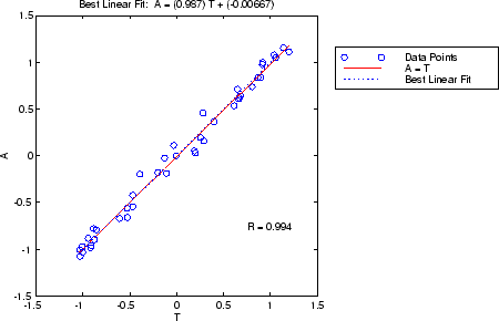 The network output and the corresponding targets are passed to regression. It returns three parameters. The first two, m and b, correspond to the slope and the y-intercept of the best linear regression relating targets to network outputs. If there were a perfect fit (outputs exactly equal to targets), the slope would be 1, and the y-intercept would be 0. In this example, you can see that the numbers are very close. The third variable returned by regression is the correlation coefficient (R-value) between the outputs and targets. It is a measure of how well the variation in the output is explained by the targets. If this number is equal to 1, then there is perfect correlation between targets and outputs. In the example, the number is very close to 1, which indicates a good fit.