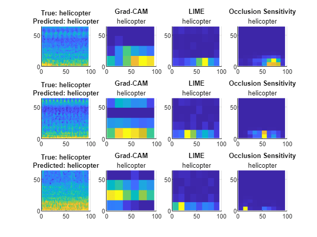 viewingAngle =[90 -90]; imgIdx = [250 500 750]; numImages = length(imgIdx); figure t2 = tiledlayout(numImages,4,TileSpacing="compact"); for i = 1:numImages img = validationFeatures(:,:,:,imgIdx(i)); YPred = validationPredictions(imgIdx(i)); YTrue = validationLabels(imgIdx(i)); mapClass = YPred; mapGradCAM = gradCAM(net,img,mapClass, ... OutputUpsampling="nearest"); mapLIME = imageLIME(net,img,mapClass, ... OutputUpsampling="nearest", ... Segmentation="grid"); mapOcclusion = occlusionSensitivity(net,img,mapClass, ... OutputUpsampling="nearest"); maps = {mapGradCAM,mapLIME,mapOcclusion}; mapNames = ["Grad-CAM","LIME","Occlusion Sensitivity"]; helperPlotMaps(img,YPred,YTrue,maps,mapNames,viewingAngle,mapClass) end