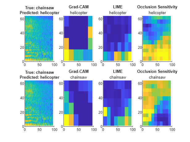 The network focuses on the area of low frequency for the helicopter class. The result matches the interpretability maps generated for the helicopter class. Visual inspection is important for investigating what parts of an input the network is using to make its classification decisions.