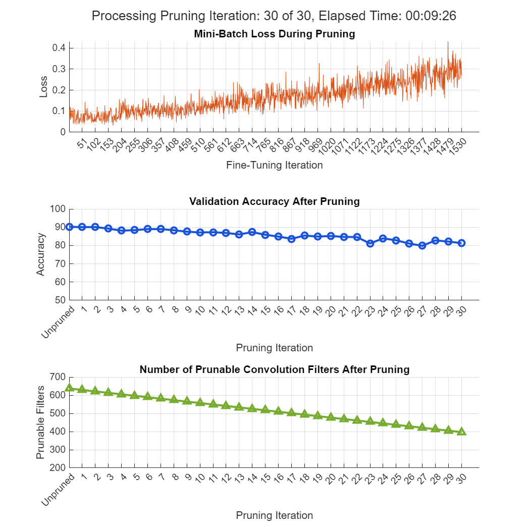 figure("Position",[10,10,700,700]) tl = tiledlayout(3,1); lossAx = nexttile; lineLossFinetune = animatedline(Color=[0.85 0.325 0.098]); ylim([0 inf]) xlabel("Fine-Tuning Iteration") ylabel("Loss") grid on title("Mini-Batch Loss During Pruning") xTickPos = []; accuracyAx = nexttile; lineAccuracyPruning = animatedline(Color=[0.098 0.325 0.85],LineWidth=2,Marker="o"); ylim([50 100]) xlabel("Pruning Iteration") ylabel("Accuracy") grid on addpoints(lineAccuracyPruning,0,accuracyOfTrainedNet) title("Validation Accuracy After Pruning") numPrunablesAx = nexttile; lineNumPrunables = animatedline(Color=[0.4660 0.6740 0.1880],LineWidth=2,Marker="^"); ylim([200 700]) xlabel("Pruning Iteration") ylabel("Prunable Filters") grid on addpoints(lineNumPrunables,0,maxPrunableFilters) title("Number of Prunable Convolution Filters After Pruning")