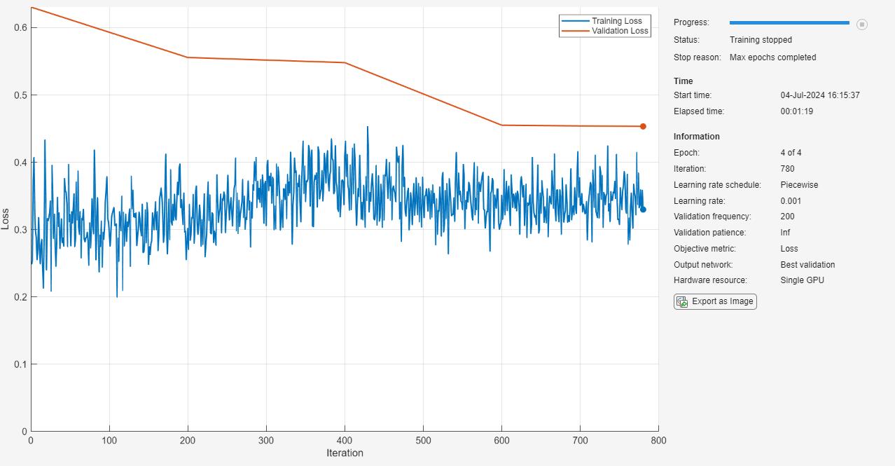options = trainingOptions("sgdm", ... MaxEpochs = 4, ... MiniBatchSize = 256, ... InitialLearnRate = 1e-2, ... LearnRateSchedule = "piecewise", ... LearnRateDropFactor = 0.1, ... LearnRateDropPeriod = 2, ... L2Regularization = 0.02, ... ValidationData = augimdsTest, ... ValidationFrequency = 200, ... Verbose = false, ... Shuffle = "every-epoch", ... Plots = "training-progress");