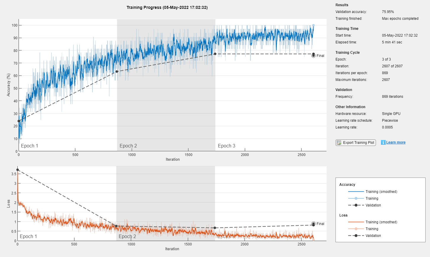 Train on a GPU if one is available. Using a GPU requires a Parallel Computing Toolbox license and a supported GPU device. For information on supported devices, see GPU Computing Requirements (Parallel Computing Toolbox).