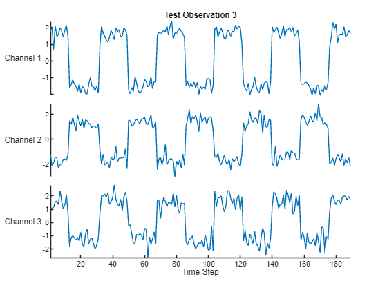 Load the example data from WaveformData. To access this data, open the example as a live script. The Waveform data set contains synthetically generated waveforms of varying lengths with three channels. This example trains an LSTM neural network to forecast future values of the waveforms given the values from previous time steps.