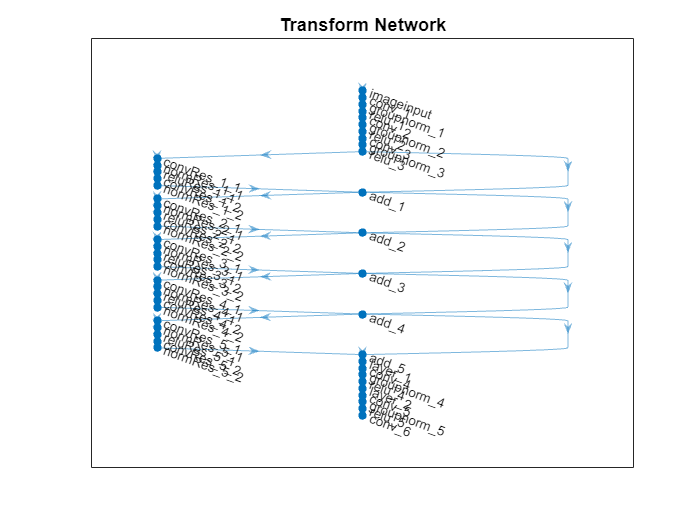 netTransform = connectLayers(netTransform,"relu_3","add_1/in2"); netTransform = connectLayers(netTransform,"add_1","add_2/in2"); netTransform = connectLayers(netTransform,"add_2","add_3/in2"); netTransform = connectLayers(netTransform,"add_3","add_4/in2"); netTransform = connectLayers(netTransform,"add_4","add_5/in2");