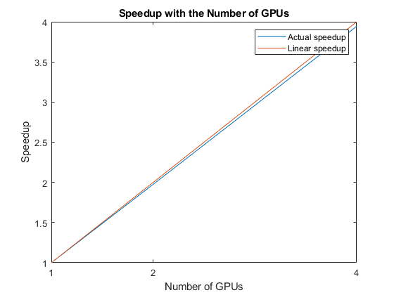 Automatic multi-GPU support can speed up network training by taking advantage of several GPUs. The following plot shows the speedup in the overall training time with the number of GPUs on a Linux machine with four NVIDIA© TITAN Xp GPUs.