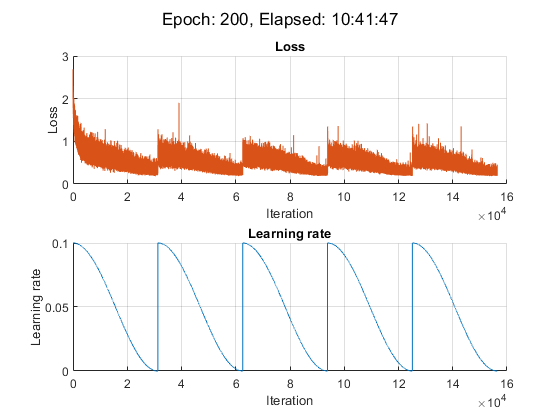 iteration = 0; start = tic; % Loop over epochs. for epoch = 1:numEpochs % Shuffle data. shuffle(mbqTrain); % Save snapshot model. if ~mod(epoch,epochsPerSnapshot) save(modelPrefix + epoch + ".mat","net"); end % Loop over mini-batches. while hasdata(mbqTrain) iteration = iteration + 1; % Read mini-batch of data. [X,T] = next(mbqTrain); % Evaluate the model loss and gradients using dlfeval and the % accelerated modelLoss function. [loss, gradients, state] = dlfeval(accfun,net,X,T,weightDecay,idxWeights); % Update the state of nonlearnable parameters. net.State = state; % Determine learning rate for cyclical learning rate schedule. learnRate = 0.5*alpha0*(cos((pi*mod(iteration-1,iterationsPerSnapshot)./iterationsPerSnapshot))+1); % Update the network parameters using the SGDM optimizer. [net, velocity] = sgdmupdate(net, gradients, velocity, learnRate, momentum); % Display the training progress. D = duration(0,0,toc(start),Format="hh:mm:ss"); addpoints(lossLine,iteration,double(loss)) addpoints(learnRateLine, iteration, learnRate); sgtitle("Epoch: " + epoch + ", Elapsed: " + string(D)) drawnow end end
