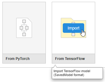In the Deep Network Designer Start Page, on the From TensorFlow tile, click Import. Importing a model from TensorFlow™ requires the Deep Learning Toolbox™ Converter for TensorFlow Models support package. If this support package is not installed, then the Import button says Install instead. Click Install to install the required support package.