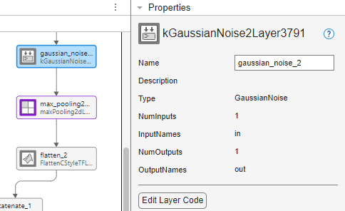 The autogenerated layers appear in the Deep Network Designer canvas with gray icons with names starting with "k". You can select a layer to see more information about its properties. Select one of the Gaussian noise custom layers. You can view and edit the layer code by clicking Edit Layer Code. The class file opens in the MATLAB® Editor.