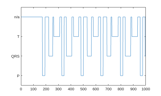testDs = subset(sds,testIdx);In this segmentation problem, the input to the LSTM network is an ECG signal and the output is a sequence or mask of labels with the same length as the input signal. The network task is to label each signal sample with the name of the region it belongs to. For this reason, it is necessary to transform the region labels on the dataset to sequences containing one label per signal sample. Use a transformed datastore and the getmask helper function to transform the region labels. The getmask function adds a label category, "n/a", to label samples that do not belong to any region of interest.