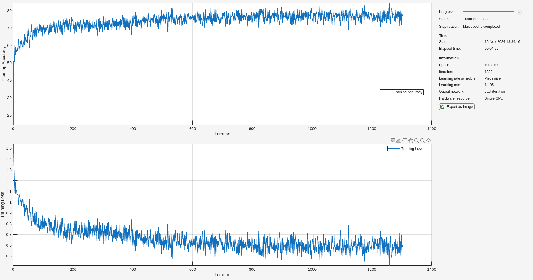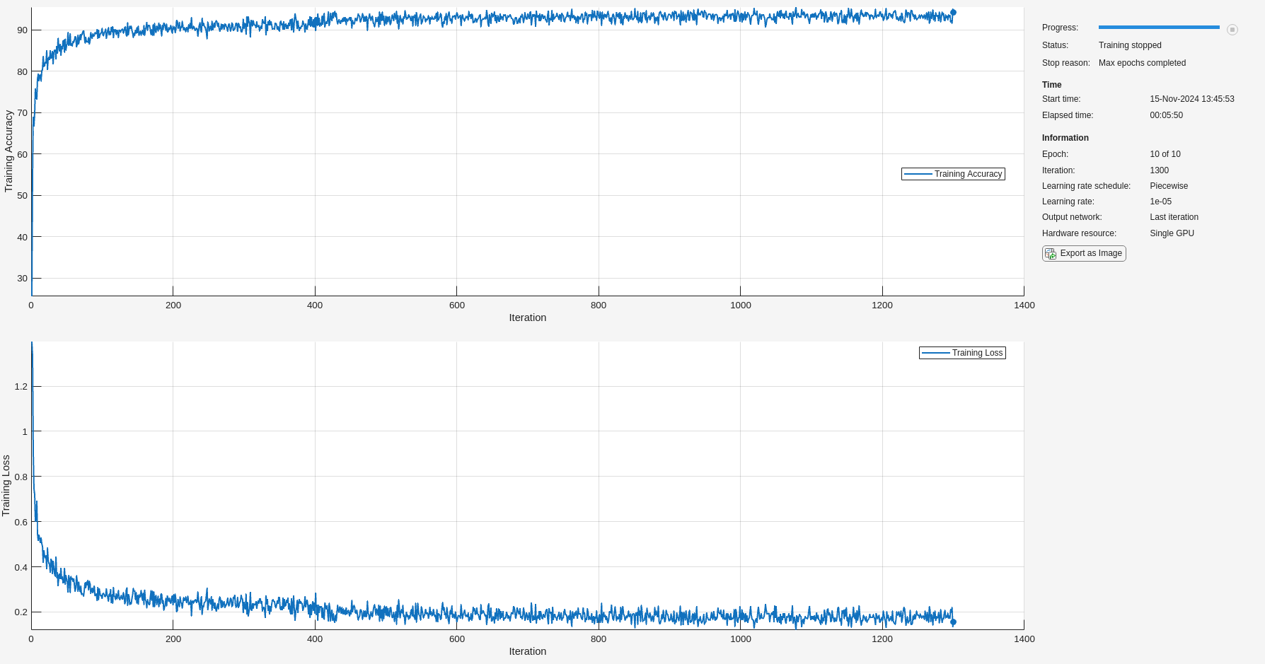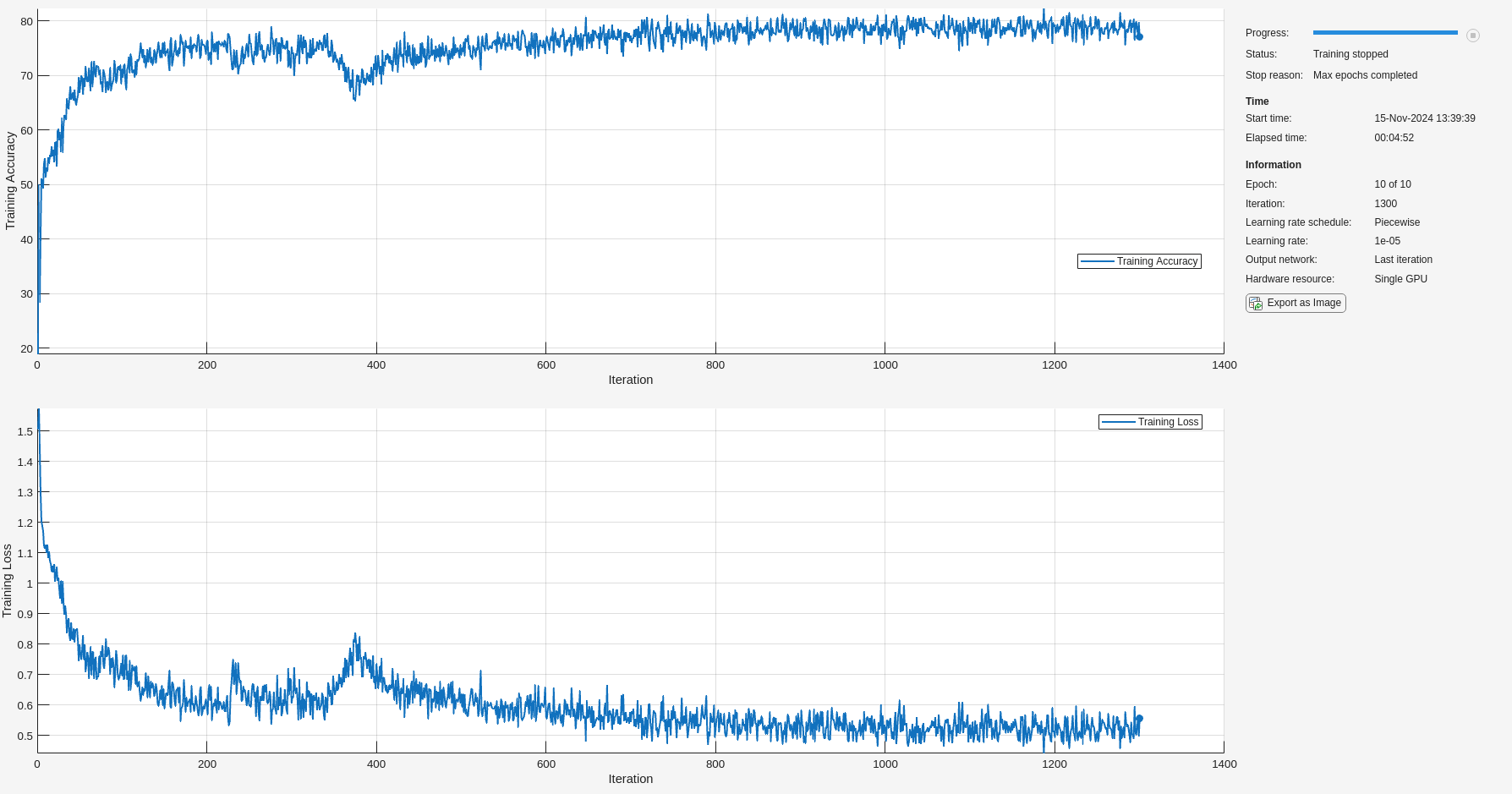 options = trainingOptions('adam', ... 'MaxEpochs',10, ... 'MiniBatchSize',50, ... 'InitialLearnRate',0.01, ... 'LearnRateDropPeriod',3, ... 'LearnRateSchedule','piecewise', ... 'GradientThreshold',1, ... 'Plots','training-progress',... 'shuffle','every-epoch',... 'Verbose',0, ... 'Metrics','accuracy');