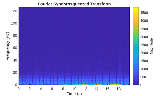 The Fourier synchrosqueezed transform (FSST) computes a frequency spectrum for each signal sample so it is ideal for the segmentation problem at hand where we need to maintain the same time resolution as the original signals. Use the fsst function to inspect the transform of one of the training signals. Specify a Kaiser window of length 128 to provide adequate frequency resolution.