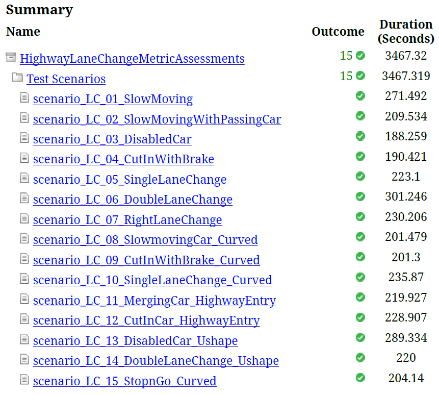 scenario_LC_01_SlowMoving— Three-lane straight road scene with a slow-moving lead vehicle in the ego lane.scenario_LC_02_SlowMovingWithPassingCar— Three-lane straight road scene with a slow-moving lead vehicle in the ego lane and a passing car in the left lane.scenario_LC_03_DisabledCar— Three-lane straight road scenario with a disabled vehicle in the ego lane.scenario_LC_04_CutInWithBrake— Three-lane straight road scene with a lead car cutting into the ego lane with a brake.scenario_LC_05_SingleLaneChange— Four-lane straight road scene with multiple vehicles in the scenario and a slow-moving lead vehicle.scenario_LC_06_DoubleLaneChange— Four-lane straight road scene with multiple vehicles in the scenario, including a slow-moving lead vehicle and a fast-moving rear vehicle.scenario_LC_07_RightLaneChange— Three-lane straight road scene with a lead car in the ego lane and a passing vehicle in the left lane that causes a right-lane change trigger for the ego vehicle.scenario_LC_08_SlowmovingCar_Curved— Curved road scene with a slow-moving lead car in the ego lane.scenario_LC_09_CutInWithBrake_Curved— Curved road scene with a lead car cutting into the ego lane.scenario_LC_10_SingleLaneChange_Curved— Curved road scene with multiple vehicles in the scenario and a slow-moving lead vehicle.scenario_LC_11_MergingCar_HighwayEntry— Highway entry scene with three vehicles in the scenario. One of the vehicles is merging into the ego lane from the highway-entry road segment.scenario_LC_12_CutInCar_HighwayEntry— Highway entry scene with four vehicles in the scenario. One of the vehicle cuts into the ego lane on the curved segment of the road network.scenario_LC_13_DisabledCar_Ushape— U-shaped scene with multiple vehicles in the scenario, including a disabled car in the adjacent lane of the ego vehicle and a slow-moving vehicle in the ego lane.scenario_LC_14_DoubleLaneChange_Ushape— U-shaped scene with multiple vehicles in the scenario, including a disabled car in the adjacent lane of the ego vehicle and a slow-moving vehicle in the ego lane.scenario_LC_15_StopnGo_Curved— Curved road scene that contains six vehicles in the scenario. The lead vehicle slows down while other vehicles travel in adjacent lanes.