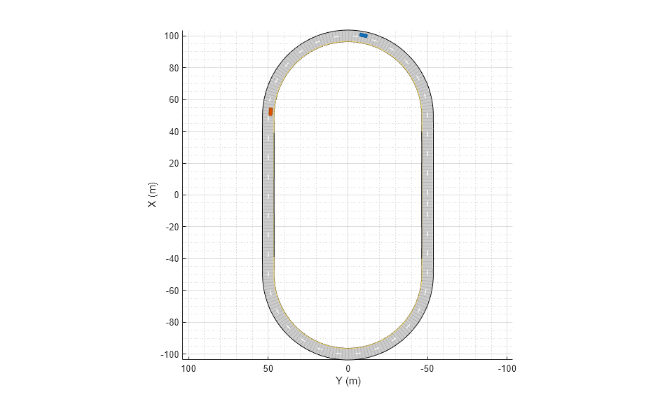 chasePlot(egoCar); fastCar = vehicle(scenario,'ClassID',1); d = 2.7/2; h = .45/2; roadOffset = [ 0 0 0 0 d 0 0 0 0 0 0 -d 0 0 0 0 -d -d -d -d 0 d d d d d d 0 -d -d -d -d 0 0 h h h h h 0 0 h h h h h 0 0]'; rWayPoints = roadCenters + roadOffset; lWayPoints = roadCenters - roadOffset; % loop around the track four times rWayPoints = [repmat(rWayPoints(1:end-1,:),5,1); rWayPoints(1,:)]; lWayPoints = [repmat(lWayPoints(1:end-1,:),5,1); lWayPoints(1,:)]; smoothTrajectory(egoCar,rWayPoints(:,:), 30); smoothTrajectory(fastCar,lWayPoints(:,:), 50);