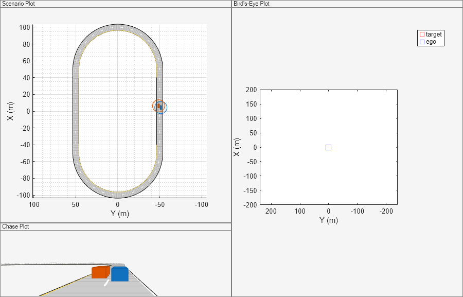 % assign scenario plot to first axes and add indicators for ActorIDs 1 and 2 plot(scenario, 'Parent', hAxes1,'ActorIndicators',[1 2]); % assign chase plot to second axes chasePlot(egoCar, 'Parent', hAxes2); % assign bird's-eye plot to third axes egoCarBEP = birdsEyePlot('Parent',hAxes3,'XLimits',[-200 200],'YLimits',[-240 240]); fastTrackPlotter = trackPlotter(egoCarBEP,'MarkerEdgeColor','red','DisplayName','target','VelocityScaling',.5); egoTrackPlotter = trackPlotter(egoCarBEP,'MarkerEdgeColor','blue','DisplayName','ego','VelocityScaling',.5); egoLanePlotter = laneBoundaryPlotter(egoCarBEP); plotTrack(egoTrackPlotter, [0 0]); egoOutlinePlotter = outlinePlotter(egoCarBEP);