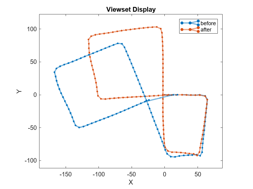 % Get the estimated trajectory after pose graph optimization to evaluate % its accuracy estimatedTrajectoryAfter = vertcat(mapBuilder.ViewSet.Views.AbsolutePose.Translation); % Overlay viewset after pose graph optimization hold(hG.Parent,'on'); plot(mapBuilder.ViewSet); hold(hG.Parent,'off'); legend(hG.Parent,'before','after')
