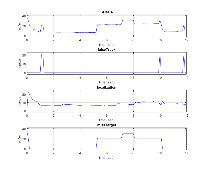 Evaluate the tracker performance — Use the generalized optimal subpattern assignment (GOSPA) metric to evaluate the performance of the tracker.