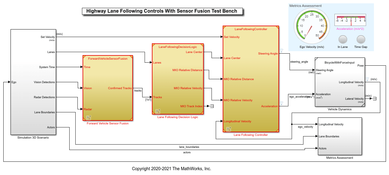 Simulation 3D Scenario— Specifies the road, vehicles, vision detection generator, and radar sensors used for the simulation.Forward Vehicle Sensor Fusion— Fuses the vision and radar sensor detections of vehicles in front of the ego vehicle.Lane Following Decision Logic— Algorithm model that specifies the lateral and longitudinal decision logic, and provides lane center information and most important object (MIO) related information to the controller.Lane Following Controller— Algorithm model that specifies the controller.Vehicle Dynamics— Specifies the dynamic model for the ego vehicle.Metrics Assessment— Assesses system-level behavior.