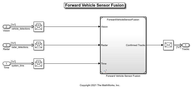 TimeRecvData.RecvData— Receives system time from theSimulation 3D Scenariosubsystem.VisionRecvData.RecvData— Receives vision detections from theSimulation 3D Scenariosubsystem.RadarRecvData.RecvData— Receives radar detections from theSimulation 3D Scenariosubsystem.TracksSendData.SendData— Sends confirmed tracks detected by this component to theLane Following Decision Logiccomponent.