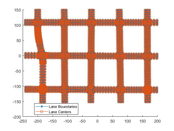 This example uses USCityBlockBidirectional scene. This scene is a 3D representation of a compact city block with 15 intersections. All roads in the scene are two-way roads with four lanes.