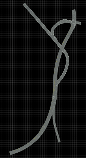 Highway lane change planner supports roads with elevation and non-uniform lane width. This example uses FreewayGauntlet.rrscene to simulate the highway lane change planner. The scene contains a one-way highway road which forks up to a bridge. Open the scene.