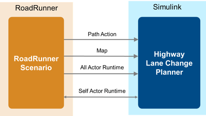 This example reuses the highway lane change planner from the Generate Code for Highway Lane Change Planner example. This planner supports specific road types and needs a reference path for planning its trajectories. As it requires time input for re-planning, you must synchronize the step size of the lane change planner model with RoadRunner scenario.