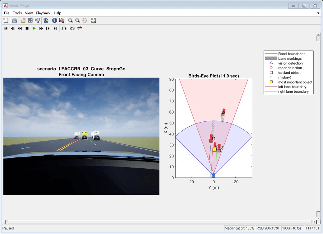 hVideoViewer = helperPlotLFDetectionResultsRR(logsout, "forwardFacingCamera.mp4", ... camera, radar, "scenario_LFACCRR_03_Curve_StopnGo",actorProfiles,... "RecordVideo", true,... "RecordVideoFileName", "scenario_LFACCRR_03_Curve_StopnGo" + "_VPA",... "OpenRecordedVideoInVideoViewer", true,... "VideoViewerJumpToTime", 11.0);