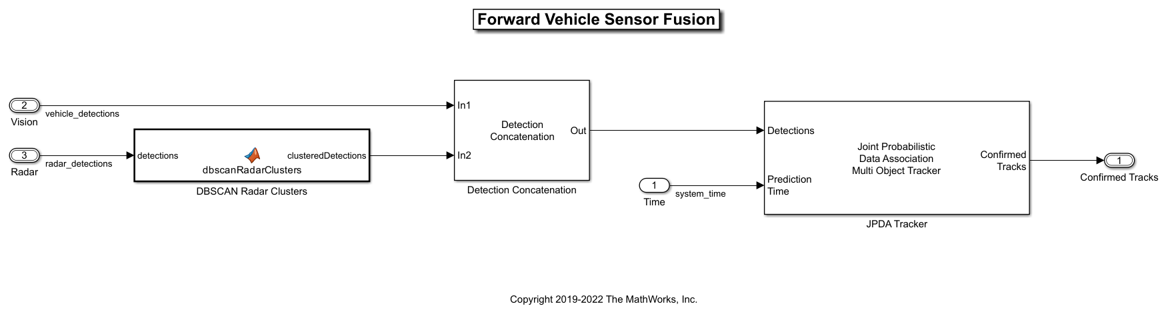 The forward vehicle sensor fusion model reads vehicle detections from vision and radar sensors. The model clusters radar detections and concatenates radar detections with vision detections. Then, the model tracks the clustered vehicle detections using a joint probabilistic data association (JPDA) tracker. For more details on forward vehicle sensor fusion, see Forward Vehicle Sensor Fusion.
