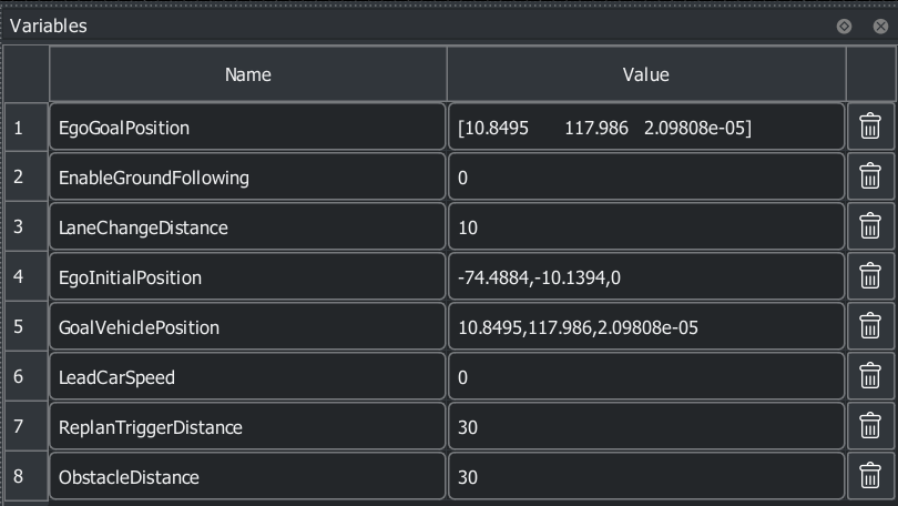 EgoGoalPosition— Goal position of the ego vehicle. This variable controls theGoalPointbehavior parameter.EnableGroundFollowing— Flag to consider banking and grade of the road. This variable controls theEnableGroundFollowingbehavior parameter.LaneChangeDistance— Distance, in meters, over which ego the vehicle completes the lane change maneuver. This variable controls theLaneChangeDistancebehavior parameter.EgoInitialPosition— Initial position of the ego vehicle.GoalVehiclePosition— Position of theGoalvehicle.LeadCarSpeed— Speed of the lead vehicle.ReplanTriggerDistance— Distance, in meters, from obstacle at which replan is triggered.ObstacleDistance— Distance, in meters, between the ego vehicle and an obstacle. This variable controls theObstacleDistancebehavior parameter.