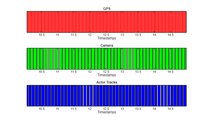 synchronize(gps,cam) synchronize(actorList,cam) helperViewMultiSensorTimes(gps.Timestamps,cam.Timestamps,actorList.Timestamps)