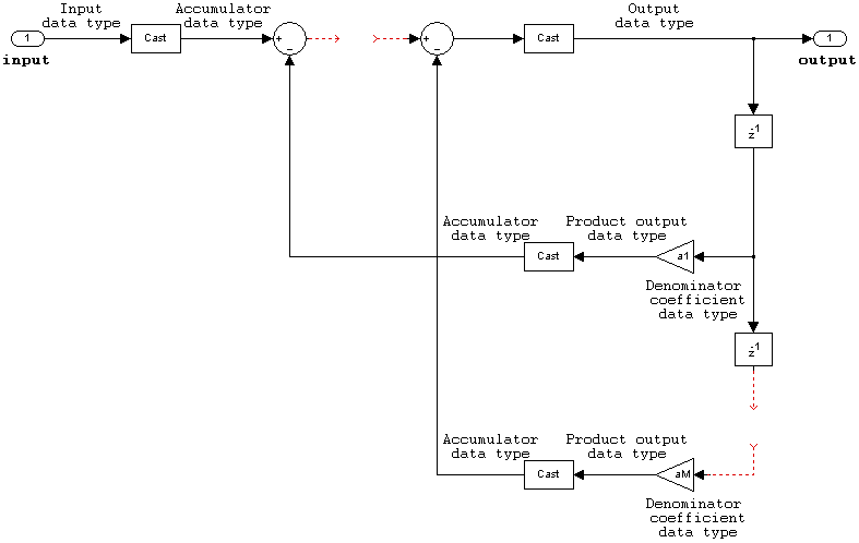 These diagrams show the filter structure and the data types used within the Allpole Filter block for fixed-point signals.