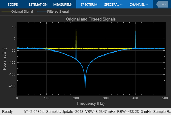 The Second-Order Section Filter block filters the noisy sinusoidal signal. Visualize the original sinusoidal signal and the filtered signal using the Spectrum Analyzer. The first tone is attenuated as it falls in the stopband region of the filter while the second tone remains unaffected as it falls in the passband region of the filter.