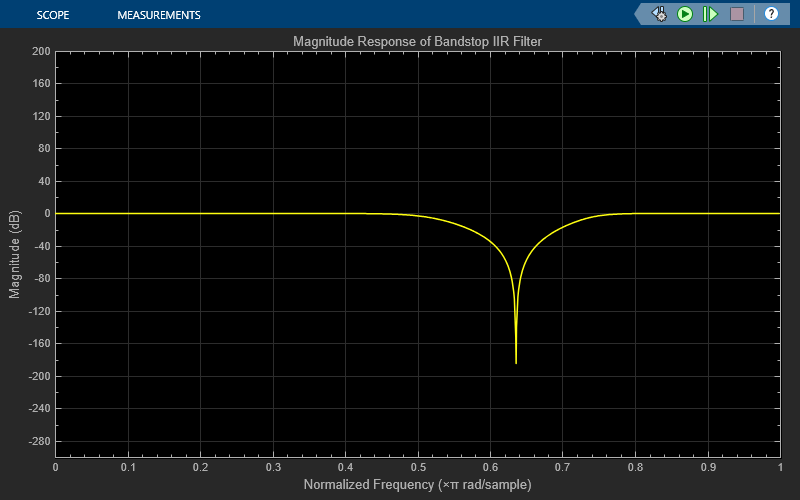 The Bandstop IIR Filter Design block designs a sixth-order bandstop IIR filter with the first and second 3-dB cutoff frequencies of 0.2