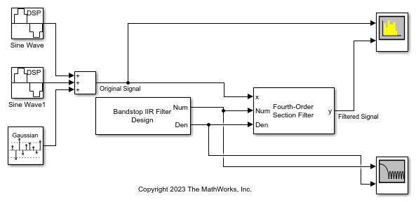 Filter a noisy sinusoidal signal using the Second-Order Section Filter block. Obtain the numerator and denominator coefficients of the SOS filter using the Bandstop IIR Filter Design block.