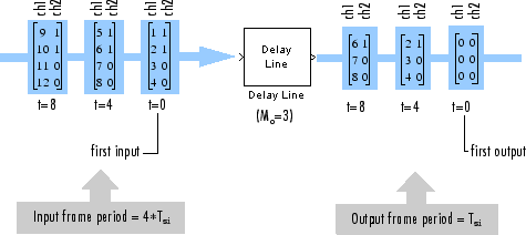 In this example, the Delay Line block rebuffers a signal with frame size 4 to a frame size of 3 using the Delay Line block.