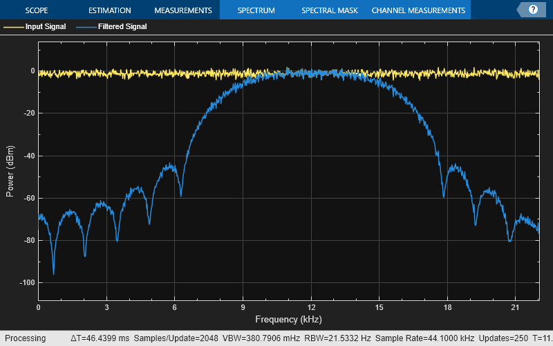 Vary the center frequency of the filter during simulation. The designBandpassFIR function redesigns the coefficients based on the updated filter specifications. Pass these updated coefficients to the FIR filter. Visualize the spectra of the input and filtered signals using the spectrum analyzer.