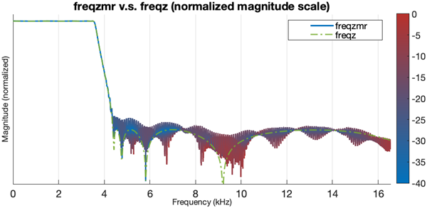 the filter. For more details on the differences between these two functions, see Comparison of freqzmr and freqz functions. For more information on