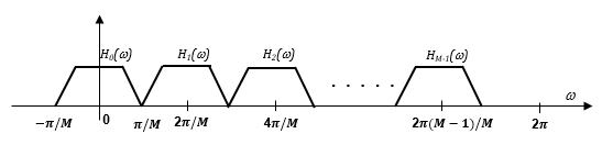 To obtain the frequency response characteristics of the filter Hk(z), where k = 1, … , M−1, uniformly shift the frequency response of the prototype filter, H0(z), by multiples of 2π/M. Each subband filter, Hk(z), {k = 1, … , M – 1}, is derived from the prototype filter.