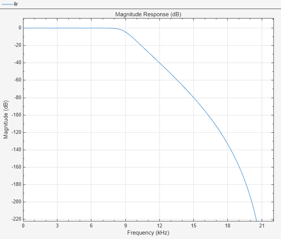 View the magnitude response of the filter. The cutoff frequency is at 0.4 rad/sample, which, with a sample rate of 44.1 kHz, translates to or 8.82 kHz.