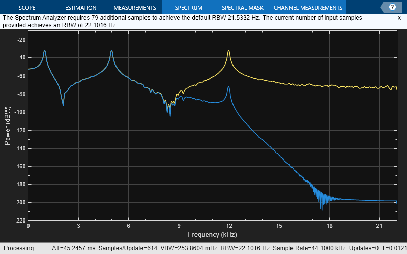 sa = spectrumAnalyzer(SampleRate=Sine1.SampleRate,... Method='welch',... PlotAsTwoSidedSpectrum=false,... OverlapPercent=80,... SpectrumUnits='dBW',... YLimits=[-220 -10]);
