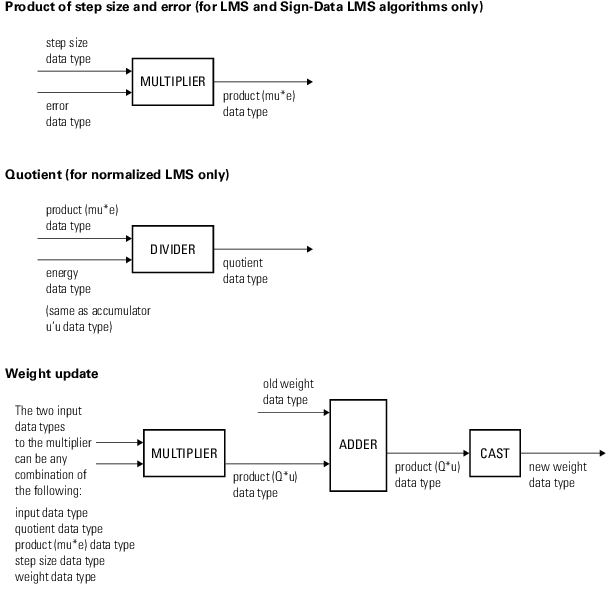 You can set the data type of the properties, weights, products, quotient, and accumulators in the System object properties. Fixed-point inputs, outputs, and System object properties must have the following characteristics: