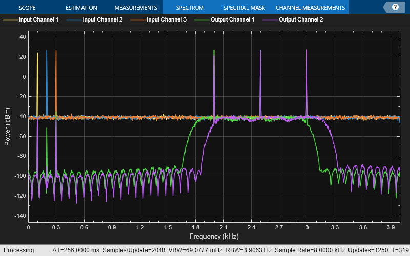 input channels before sending them as outputs. For more information, see Modeling MIMO System with Multiple Propagation Paths.mimoFilter = dsp.MIMOFIRFilter