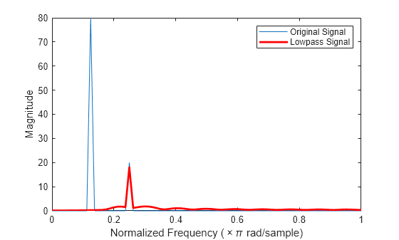 Figure contains an axes object. The axes object with xlabel Normalized Frequency ( times pi rad/sample), ylabel Magnitude contains 2 objects of type line. These objects represent Original Signal, Lowpass Signal.