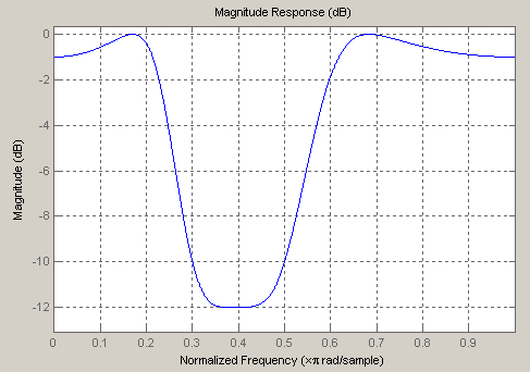 d = fdesign.parameq('N,Flow,Fhigh,Gref,G0,GBW,Gst',... 4,.3,.5,0,-12,-10,-1); Hd = design(d,'cheby2'); fvtool(Hd)