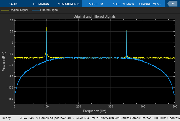 The Second-Order Section Filter block filters the noisy sinusoidal signal. Visualize the original sinusoidal signal and the filtered signal using the Spectrum Analyzer. The first tone is attenuated as it falls in the stopband region of the filter while the second tone remains unaffected as it falls in the passband region of the filter.