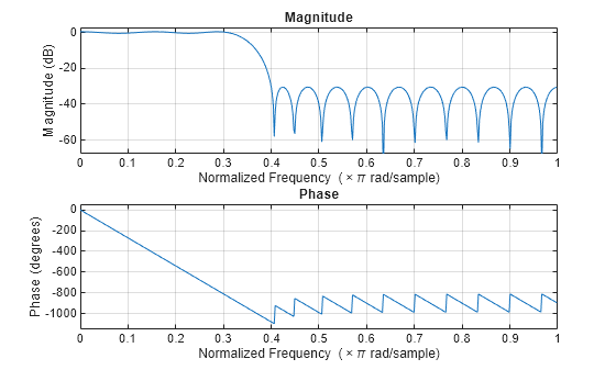 Comparing this filter to the filter in Figure 1. The cutoff frequency wo = 0.4 now applies to the edge of the stopband rather than the point at which the frequency response magnitude is 0.5.