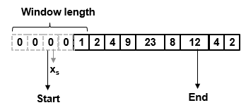 In this example, the Hampel filter slides a window of length 5 (Len) over the data. The filter has a threshold value of 2 (nσ). To have a complete window at the beginning of the frame, the filter algorithm prepends the frame with Len – 1 zeros. To compute the first sample of the output, the window centers on the [Len12+1]th sample in the appended frame, the third zero in this case. The filter computes the median, median absolute deviation, and the standard deviation over the data in the local window.