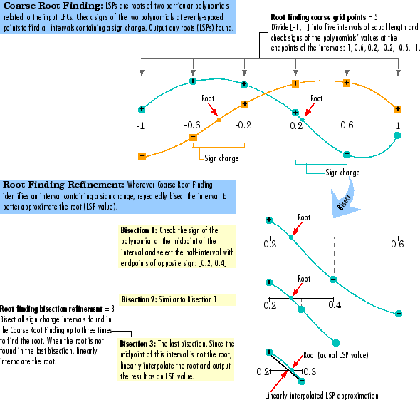 LSPs, which are the roots of two particular polynomials, always lie in the range (-1, 1). (The guaranteed roots at 1 and -1 are factored out.) The block finds the LSPs by looking for a sign change of the two polynomials' values between points in the range (-1, 1). The block searches a maximum of k(n – 1) points, where: