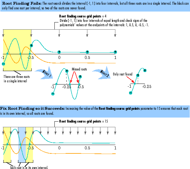 In particular, the block can fail to find some roots if the value of the Root finding coarse grid points parameter, n, is too small. If the polynomials oscillate quickly and have roots that are very close together, the root finding might be too coarse to identify roots that are very close to each other, as illustrated in Fixing a Failed Root Finding.