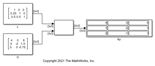 The block factors this matrix into upper and lower triangular matrices. For a more detailed version of this example, see Factorize Matrix Using LU Factorization Block.