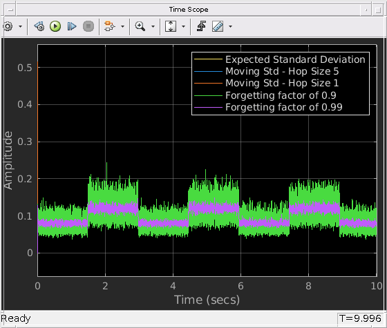 Compare the sliding window standard deviation method and the exponentially weighted standard deviation method in Simulink® using the Moving Standard Deviation block.